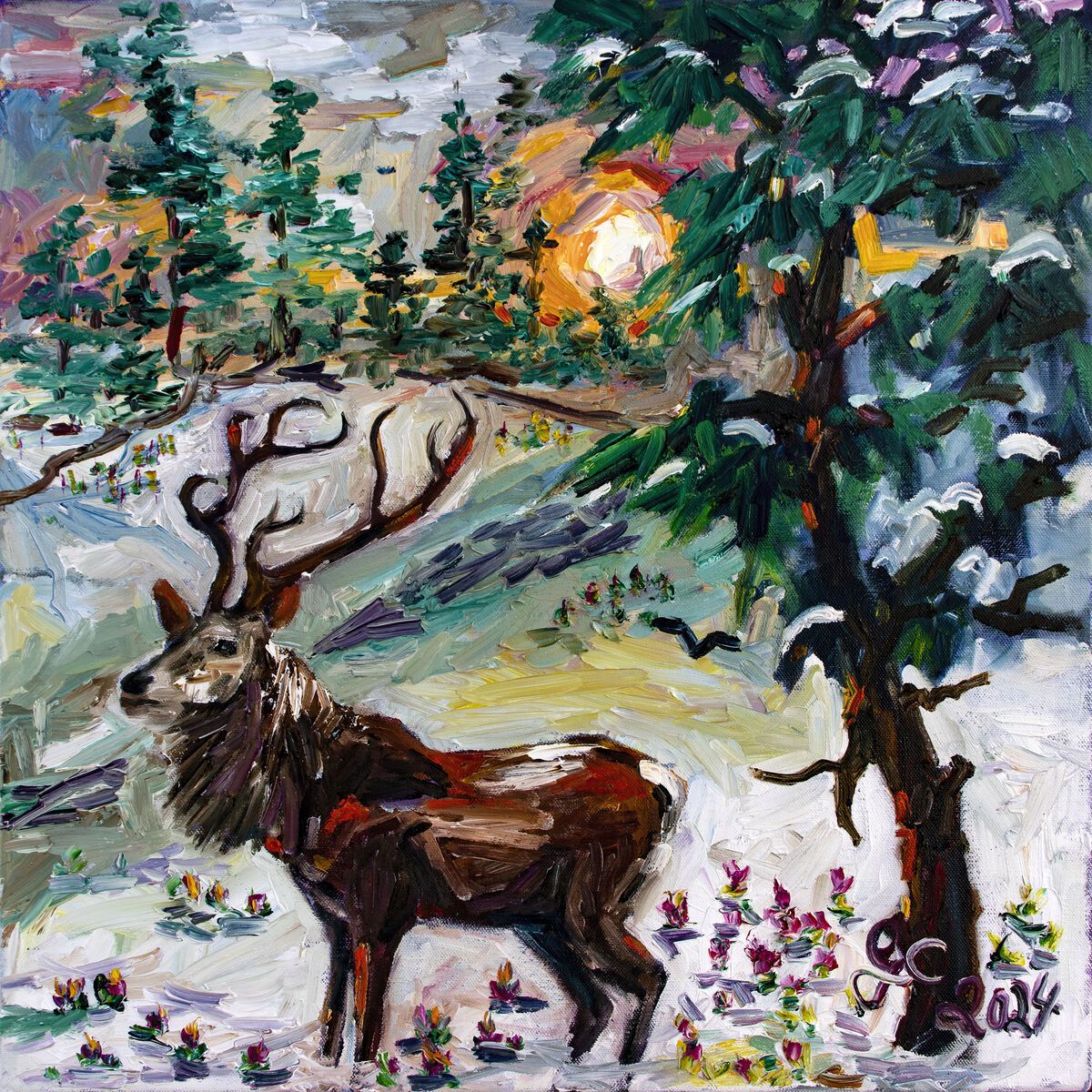 Winter Wonderland Transition to Spring Size in inches: 20 by 20 Size in Centimeters: 50.8 by 50.8 Medium: Oil Surface: Canvas Framed: No Signed: Yes (front and back)